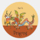 Une illustration de dragon de dessin animé fantaisiste sur un autocollant rond est en marron, or, orange, avec un dessous bleu pâle. Vous pouvez modifier du texte pour créer votre propre cadeau personnalisé. Besoin d'aide, envoyez un courriel à lilly@lillyarts.com