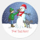 The boy builds a wonderful snowman while it's snowing with his cute dog.