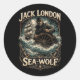 A dramatic nautical illustration of a hardened sea captain steering through storm-tossed waves, inspired by Jack London’s classic tale of survival and the wild sea.