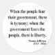 "Quand le peuple craint son gouvernement, il y a la tyrannie ; quand le gouvernement craint le peuple, il y a la liberté." - Thomas Jefferson