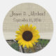 Camouflage rustique en bois avec tournesol jaune et conception de burlap léger préférez autocollant pour compléter notre ensemble de mariages campagnards. Modifiez le texte pour répondre à vos besoins.