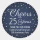 Ajoutez une touche de finition personnalisée aux cartes de remerciement ou aux cadeaux de fête d'anniversaire de mariage avec ces autocollants ronds ou sceaux de lettre en faux argent, bleu marine et gris. Tout le texte est simple à personnaliser ou à supprimer. Ce modèle est configuré pour un 25e anniversaire, mais peut être facilement modifié pour une autre année ou un autre événement, tel qu'un anniversaire. Le design présente des points de confettis en feuille de faux argent sur fond noir, une calligraphie "Cheers to 25 years" élégante et une typographie minimaliste moderne avec un message personnalisable en bas. Veuillez noter que le gris est imprimé pour simuler l'argent et n'est pas une feuille métallique.