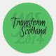 Autocollant rond vert avec 'transformez l'Ecosse' au premier plan et 'Oui 2014' en arrière - plan.