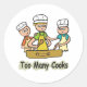 Trop de cuisiniers montre trois cuisiniers avec des cuillères à la main se disputant sur une casserole. Illustration du vieil adage avec le libellé "trop de cuisiniers" ci-dessous. Un dessin humoristique de cuisine.