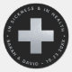 Un autocollant en noir et argent pour le Kit d'urgence (aka Kit Hangover) pour mettre dans un sac d'accueil de mariage de destination, avec un peu de médicament à l'intérieur. Il a une fausse croix de feuille d'argent dans le centre et le texte voûté faisant un cercle autour. Au-dessus, il y a le message "En maladie et en santé" et en-dessous il y a les noms de la mariée et du marié et la date. Le texte est en petits casquettes gris argenté, semblable en couleur au faux argent de la croix. l'arrière - plan est noir.