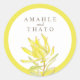 Belle tulipe jaune printemps leucadendron aquarelle art mariage rond autocollants. Modifiez avec vos propres noms. Idéal pour un mariage jaune ou sud-africain ou un mariage à thème de plantation autochtone. Peinture à l'aquarelle botanique moderne et stylisée par Sarah Trett pour www.mylittleedenweddings.com