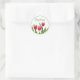 Cet autocollant rond présente un joli nom écrit en vert sur un ensemble de fleurs de tulipes rouges avec une bordure circulaire foncée verte.