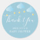 Twinkle scintille petit baby shower étoile bleu merci, autocollant rond classique. Conçu pour coordonner avec notre collection Twinkle baby shower. Avec de mignons nuages bleus et des étoiles d'or sur des cordes, sur un arrière - plan bleu pastel, ces autocollants de baby shower sont parfaits pour sceller des enveloppes et des faveurs de baby shower. Ajoutez les détails de votre célébration en blanc pour créer l'autocollant parfait.