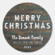 Typographie Rustique en bois foncé Joyeux Sticker rond classique de Noël. Texture moderne en bois foncé, neige blanche et texte en typographie blanche tendance. Personnalisez cet autocollant et faites votre propre grand sceau d'enveloppe ou un autocollant d'emballage cadeau pour les vacances. Vous pouvez modifier ou effacer n'importe quel texte sur l'autocollant. Le design est fait pour correspondre aux objets de la collection Rustic de vacances en bois foncé.