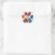 Un joyeux chien de berger australien est assis devant les motifs colorés des empreintes de pattes, et présente un mélange éclatant de tons rouges, violets et bleus
