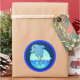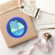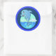 Illustration d'un mignon dauphin sautant de l'océan dans les tons bleu et vert. Sticker a une large bordure en bleu avec un motif ondulé dans des tons différents de bleu.