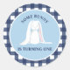 Des stickers de fête d'anniversaire de premier anniversaire de Bunny bleu en vichy printemps.