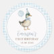 Dotée d'une jolie illustration d'un charmant canard dans une cravate à arc et un casquette de fête, cet autocollant rond est encadré d'une douce bordure bleu pastel en vichy pour un look fantaisiste et rustique.