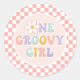 Une fille super ! Retro checker imprimé avec les stickers fête d'anniversaire de la marguerite en rose.