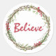 Elégante et moderne enveloppe ou autocollant cadeau pour Noël avec le texte 'Believe' dans la calligraphie de script chic rouge et une touche élégante de verdure d'hiver et de couronnes de fruits. Conçu exclusivement pour vous par Happy Dolphin Studio. Si vous avez besoin d'aide ou de produits correspondants, veuillez nous contacter à happydolphinstudio.com .
