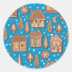 Motif vectoriel tiré à la main avec diverses maisons en pain d'épice, sapins, flocons de neige et biscuits en forme de croissant sur le bleu avec chute de neige
