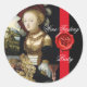 Belle jeune fille blonde avec robe magnifique et bijoux en or avec casquette rouge et plumes blanches tenant une assiette remplie de raisins rouges jaunes, vignes, feuilles de chute verte rouge avec un paysage lacustre en arrière - plan par le peintre allemand Lucas Cranach l'Ancien 1530.Classic, élégant collage numérique de style vintage .avec des peintures flamandes et allemandes.Ce design Renaissance classe sceau et bande de cire rouge est parfait pour les mariages d'automne, fêtes d'anniversaire, 16 anniversaires doux, sauver la date, cartes de remerciement, baby showers, fêtes de vacances, réunions de famille.il peut être utilisé aussi comme invitations d'affaires pour nutritionnistes, diététistes, traiteurs, service de nourriture, préparation ou restaurant, restauration, industrie du vin.
