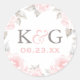 Elégant et romantique mariage ronde faveur autocollant design caractéristiques blush et gris d'étain initiales monogramme personnalisé et date mariage qui est encadré par une bordure de roses rose douce avec feuilles vert / gris. Les fleurs ont un bel aspect aquarelle peint.