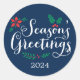 Un design d'autocollant / de sceau d'enveloppe de vacances rond comprend le texte « Vœux de saison » en blanc, rouge et vert avec un fond de couleur bleu marine (pouvant être personnalisé). Texte personnalisé pour l'année.