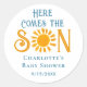 Ce mignon autocollant de baby shower au thème du soleil présente un soleil jaune aquarelle et "Voici le Fils" dans une typographie bleu rétro stylisée. Parfait pour le baby shower d'un garçon. Facile à personnaliser. Aquarelle originale © Michele Davies.