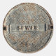 Un trou d'égout en métal, probablement en acier, dans une rue. Des autocollants amusants à mettre partout et partout! Les ouvriers du bâtiment, de l'entretien, les ouvriers de la route, amusez-vous à les mettre dans des endroits bizarres au travail au hasard ! Voir plus de nos conceptions de Construction et d'égouts dans notre magasin.