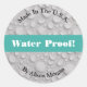 "Water Proof" Sticker with bold teal line and white text on water drops with white background. Comes with two extra text lines: Made In The U.S.A. and name. Or, personalize message and photo to your needs. Place on packages, etc.