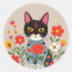 Sticker Rond Whimsical Folk Art Chat noir et fleurs