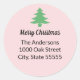 Vous pouvez personnaliser le texte noir avec votre message et votre nom personnalisés. En haut, vous pouvez customiser le script noir qui dit "Joyeux Noël". Il y a du texte d'affichage noir que vous pouvez modifier pour afficher votre nom et votre adresse de retour. Cet autocollant rose pâle a un arbre de Noël vert au-dessus du texte.