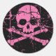 These t-shirts and other items are adorned with a worn and cracked skull and crossbones in a pink and black or pink and pink color scheme.
