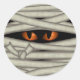 Une momie déplaisante et enveloppée avec des yeux oranges brillants et des bandages de gaze classique orne cet autocollant rond d'Halloween. Également disponible dans une palette de couleurs vertes. Cherchez ID685 pour voir la coordination des fournitures et accessoires de la fête avec ce grand motif momie.