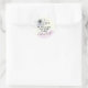 Un autocollant rond avec une citation inspirante des écritures dépeint un design abstrait moderne avec des touches et des éclaboussures lavande et rose. Il comporte une partie d'une Bible Verse Zephaniah encourageante 3:17, "Avec son amour, il calmera toutes vos peurs."