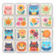 Petits animaux fantaisistes colorés et carrés de fleurs. Chats, fleurs, lion, hibou.