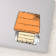 Ce dessin de cacahuètes représente Snoopy, reposant partiellement à l'intérieur de sa niche emblématique, décorée pour Halloween. Le toit de la niche est peint d'une orange vif, et des toiles éffrayantes ornent les coins à la fois sur le toit et sur les murs, ajoutant à l'atmosphère étrange et festive. Snoopy, en regardant du bas à droite, semble surveiller avec une expression calme, presque endormie, ajoutant un sentiment de calme charme d'Halloween à la scène.