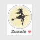 Image d'une silhouette de sorcière chevauchant un balai devant une lune brillante. La sorcière a de longs cheveux soufflant dans le vent, un casquette pointu de sorcière, habillé d'une jupe et de chaussures à talon élevé.