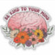 Embrassez la beauté du bien-être mental avec cet autocollant "Be Kind to Your Mind". Avec une illustration vibrante du cerveau entourée de fleurs sauvages colorés, cette conception est un doux rappel pour vous aider à développer votre santé mentale et à vous entrainer. Cet autocollant est une belle façon de promouvoir la pleine conscience et la compassion, parfait pour décorer des journaux, des planificateurs, des ordinateurs portables, ou tout espace qui inspire la positivité. Faites passer la gentillesse à vous-même et aux autres avec cet accessoire réfléchi!