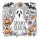 A playful Halloween illustration featuring a cheerful ghost flashing peace signs, surrounded by jack-o’-lanterns, bats, spider webs, stars, and autumn florals. The phrase “Spooky Season” anchors the design with festive flair, blending whimsy and seasonal charm. Perfect for October collections, lighthearted themes, and designs that celebrate the cozy mischief of Halloween.