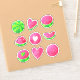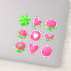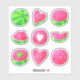 Autocollant d'été doux et frais. Lumineuses tranches de pastèque, coeurs et graines. Couleurs rose et verte.