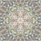 A symmetrical, kaleidoscopic design forms the centerpiece, with intricate, interconnected shapes and muted colors creating a harmonious pattern. The radial symmetry and organic shapes evoke a sense of depth and complexity.