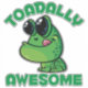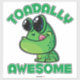 Un mignon crapaud de dessin animé aux grands yeux noirs et une expression enjouée avec sa langue qui sort s'assoit au centre entouré du texte ludique Toadally Awesome. L'amphibien vert vif se distingue par son arrière - plan solide qui ajoute un élément amusant et engageant à la conception. Tags : crapaud, grenouille, amphibien, dessin animé, humour, heureux, drôle, citation, joyeux, mignon, décalé, fou, vert, caractère, joueuse, sourire, texte, amical, bleu, langue, animal, idiot, inspirationnel, motivationnel, vibrant, adorable, bizarre, typographie