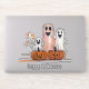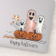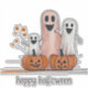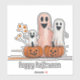 C'est un autocollant d'halloween mignon qui comporte trois fantômes heureux et deux Jack o' Lanterns. Vous pouvez customiser le texte par défaut "happy halloween".