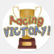 Collier de trophée doré brillant, avec des graphiques d'un trophée de style coupe d'or. Texte graphique coloré, à travers le milieu : Racing Victory. Parfait comme fête d'anniversaire favorise ou récompense autocollants pour une course voiture thème de la fête d'anniversaire garçon.
