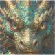 A sticker with a cool close up illustration of a turquoise and metallic gold dragon face with realistic eyes.