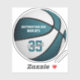 Cet autocollant personnalisé de basket-ball présente l'image réaliste d'un basketball qui a alternativement des panneaux recolorés turquoises et blancs sur lesquels vous pouvez personnaliser le nom et le numéro de maillot de l'athlète ainsi que le nom de l'école ou du club et le nom de la mascotte - par katz_d_zynes