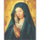 L'arrière - plan claire et sombre contraste avec la tête brune rayonnante de la Vierge et la coiffe blanche qui la recouvre, et ses mains sont délicatement fermées ensemble