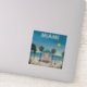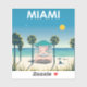 Illustration de l'affiche de voyage Retro Miami Florida qui donne sur une station de sauveteur sur Miami Beach bordée de palmiers, ensoleillée et sablonneuse. Ce design vintage vous rappellera des affiches de voyage classiques d'une époque révolue.