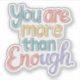 Cet autocollant de levage est un beau rappel de votre valeur et de votre valeur intrinsèques. Doté de l'expression habilitante "Vous êtes plus que suffisant" dans une police ludique, cet autocollant est une façon parfaite de renforcer l'estime de soi et de propager la positivité. Fabriqué avec du vinyle durable, cet autocollant est idéal pour les ordinateurs portables, les bouteilles d'eau, les journaux, les miroirs, et plus encore. Partagez ce message d'amour de soi avec vous et les autres !