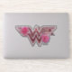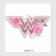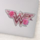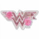Le logo Wonder Woman classique parmi les fleurs de camillia roses.