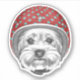 Ce dessin présente le portrait d'un Yorkshire Terrier portant un casque pointillé turquoise et rouge à pois.