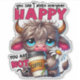 A funny, sarcastic, and colorful design showcases an adorable highland cow with big blue eyes, brown fur, and a sad expression, holding a steaming cup of coffee and a daisy. The vibrant text reads, "You can't make everyone happy, you are not coffee." This charming design is available on a variety of products, making it a perfect gift for coffee lovers.