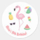 stickers fête d'anniversaire qui vient avec un joli flamand rose, ananas jaune, balle de plage multicolore, lunettes de soleil, glace popsicle et tranche de pastèque! Idéal pour un été, soirée d'anniversaire à thème tropical et luau. Personnalisez avec votre message de remerciement dans le modèle texte fourni.
